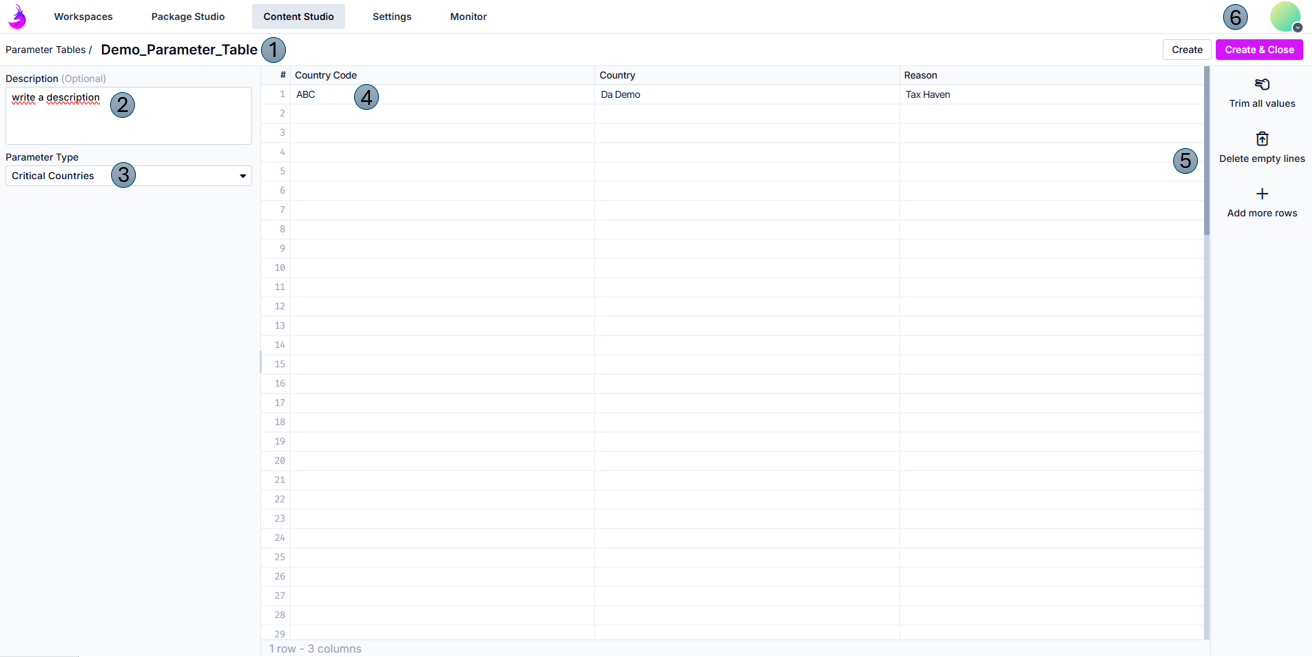 - Tabelleninhalte: basierend auf der Wahl des Parametertyps kannst Du in der Tabelle rechts daneben die Felder befüllen. Bspw. kannst Du bei der Wahl von Critical Countries eintragen, welche Länder für Dein Unternehmen aus welchen Gründen als kritisch eingestuft wurden (z.B. weil das Land eine Steueroase ist)