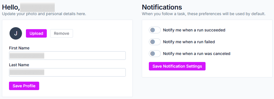 Du kannst im folgenden Screen auf der rechten Seite festlegen, für welche Runs Du standardmäßig benachrichtigt werden möchtest. Du kannst Dich bei erfolgreichen, fehlgeschlagenen oder abgebrochenen Runs benachrichtigen lassen. Stelle Deine Präferenzen ein und klicke auf Save Notification Settings.
