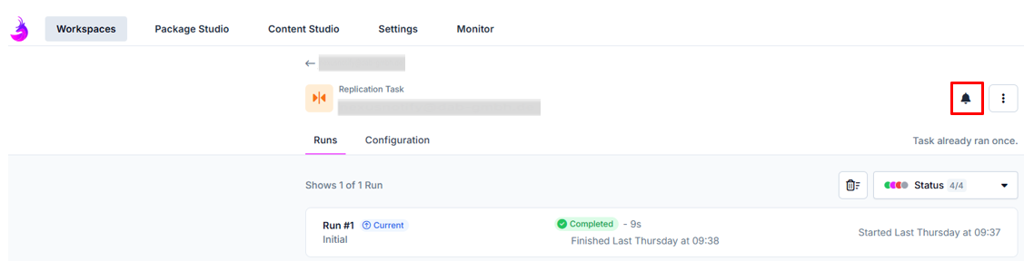 Klicke oben auf Workspaces, klicke in der Auflistung auf einen beliebigen Workspace, klicke in der Taskübersicht auf einen beliebigen Task und dann klick oben rechts in der Aufgabe auf das Glocken-Symbol, sobald der Lauf startet: