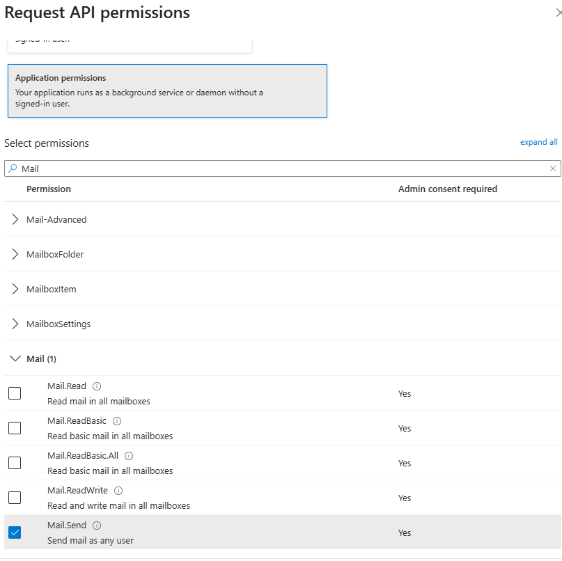 Service Principal - Beim Versenden von E-Mails über SMTP authentifiziert sich die Anwendung über den Service Principal mit ClientID und Client Secret. Damit wird ein Zugriffstoken von Microsoft Entra ID geholt, das zur Anmeldung beim SMTP-Server verwendet wird. Die E-Mail wird dann im Namen eines Postfachs verschickt. Füge die Mail.Send API-Berechtigungen hinzu: Geh zu Verwalten → API Berechtigungen in deiner Azure Enterprise-Anwendung. Klick auf den Tab API permissions und dann auf Add a permission. Wähl Microsoft Graphaus der Liste der verfügbaren Berechtigungen.Wähl Application permissions aus, such im Suchfeld nach ‚Mail‘ und setz ein Häkchen bei Mail.Send in der Liste. Füg die Berechtigung über den Button Add Permissions hinzu. Gib die Admin-Zustimmung für die Mail.Send Berechtigung der Microsoft Graph API. Stell sicher, dass die Berechtigung im Berechtigungsraster angezeigt wird. Mailbox Berechtigungen - Der Service Principal muss Zugriff auf das Postfach haben, von dem aus E-Mails gesendet werden. RBAC ür Anwendungen in Exchange Online erlaubt es Admins, einer App Berechtigungen zu geben, damit sie eigenständig auf Daten zugreifen kann. Diese Berechtigung kann mit einem sogenannten Resource Scope kombiniert werden, um festzulegen, auf welche Postfächer die App zugreifen darf.