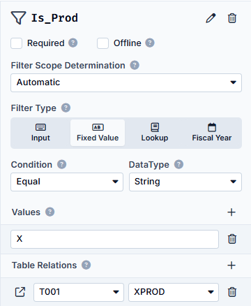 Als Value geben wir nun das X an und in den Table Relations legen wir fest, dass dieser Filter in der Tabelle T001 für das Feld XPROD gesetzt wird. Damit sieht der Detailbereich wie folgt aus (bei der Wahl des Filters links):