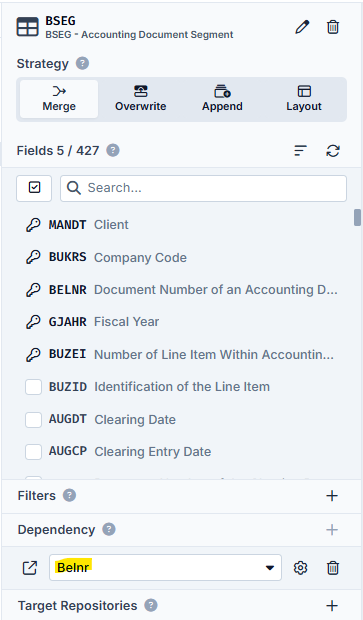 Das bedeutet, dass die BSEG in Abhängigkeit (Dependency) von unserem Repository Belnr gefiltert wird.