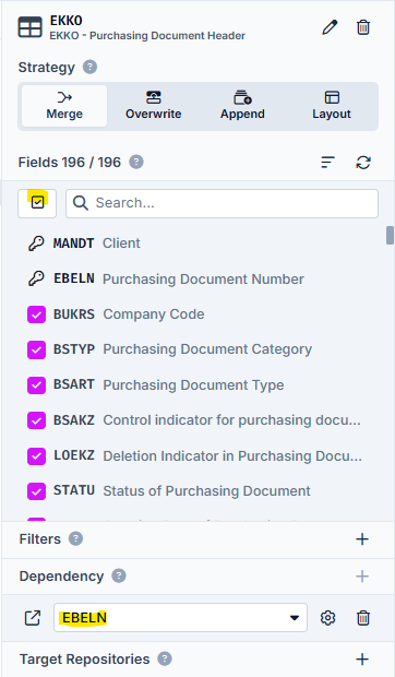 Am Ende wollen wir die Tabelle EKKO mit den gefundenen Bestellnummern filtern, um alle weiteren Bestellkopf-Informationen zu erhalten. Wir binden nun also noch die EKKO ein. Da wir hier alle vorhandenen Informationen extrahieren möchten, markieren wir mit der Schaltfläche All nun alle Felder. Diese Tabelle wird wieder in Abhängigkeit (Dependency) des vorherigen Repositories EBELN gefiltert.