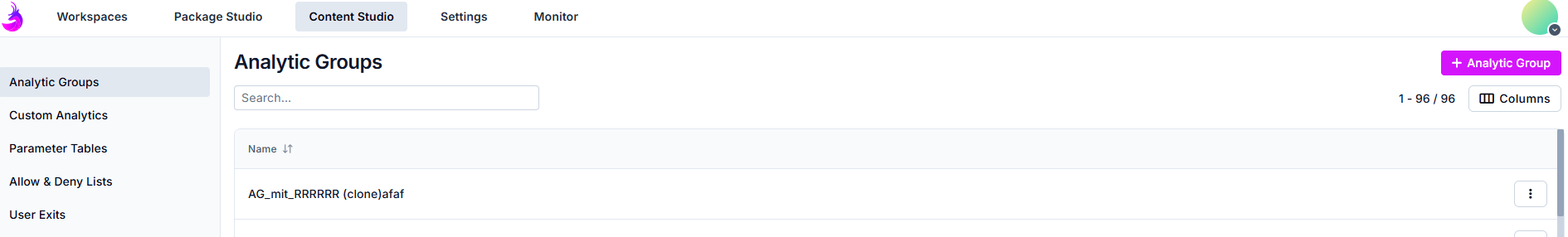 Du kannst eine Analytic Group erstellen, indem Du auf Content Studio > Analytic Groups und auf + Analytic Group klickst:
