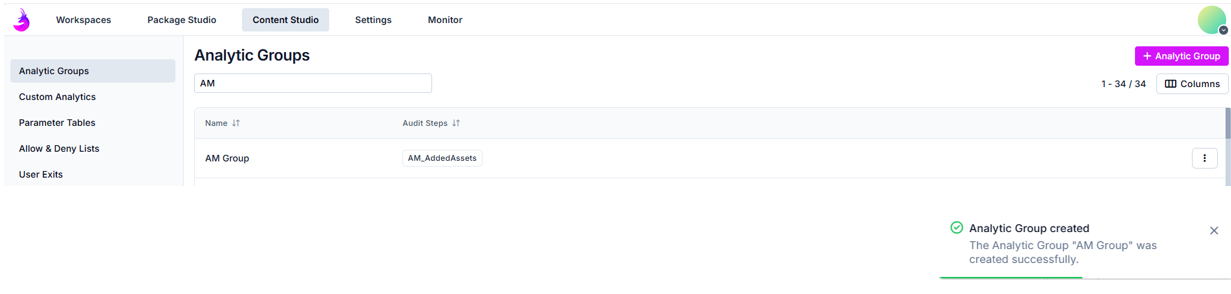 - Create bzw. Create & Close: sobald alle Einstellungen hinterlegt sind, kann die Analytic Group gespeichert werden. Mit Create & Close wird sie erstellt, diese Ansicht wird automatisch verlassen und Du kehrst zurück zur Übersicht der vorhandenen Analytic Groups. Hier erscheint eine Meldung für das erfolgreiche Anlegen der Gruppe.