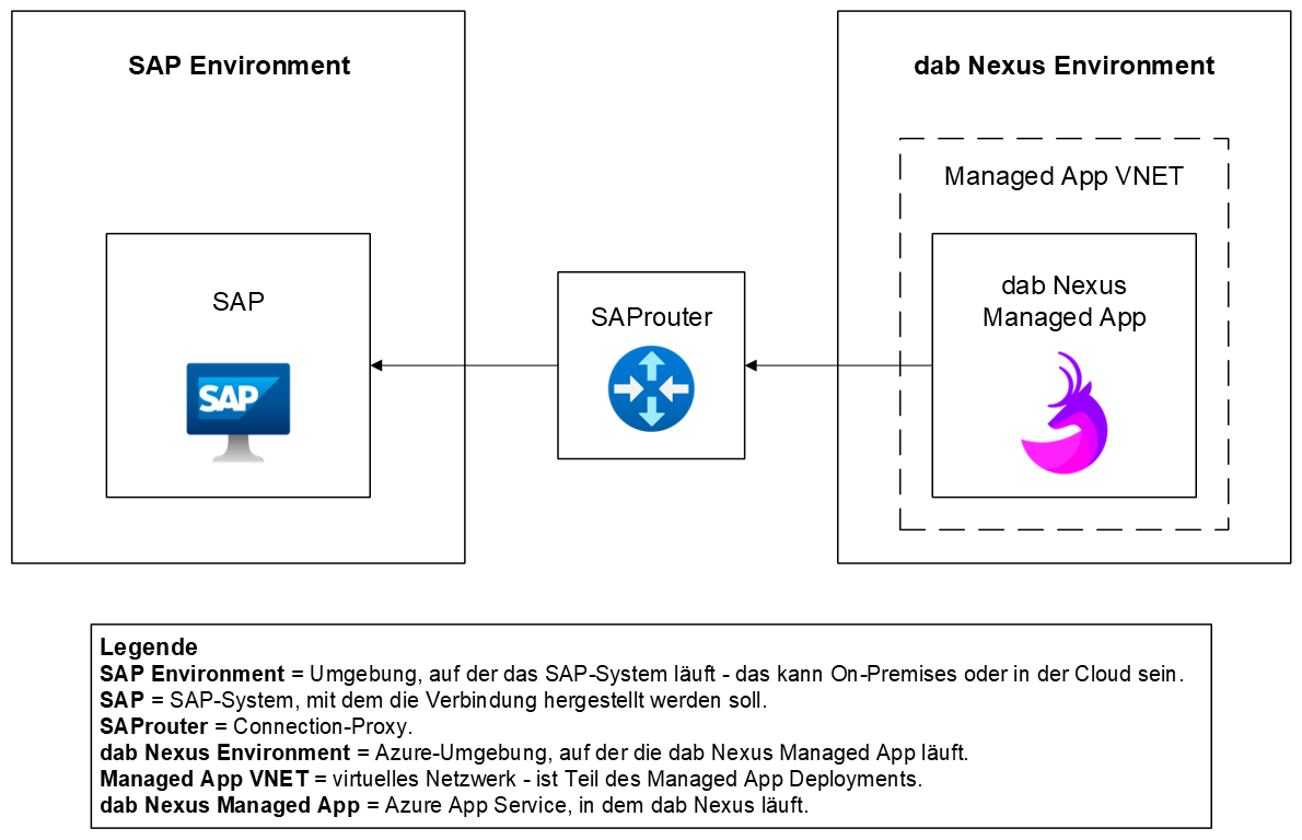 Beim SAProuter handelt es sich um eine von SAP bereitgestellte Lösung die es ermöglicht, SAP-Verbindungen über Netzwerkgrenzen hinweg aufzubauen. Voraussetzung hierfür ist, dass eine SAProuter-Instanz in der selben Netzwerkumgebung eingerichtet ist, wie das SAP-System. Im Anschluss an die Einrichtung muss es möglich sein, eingehende Verbindungen von dab Nexus zum SAProuter zu erhalten.