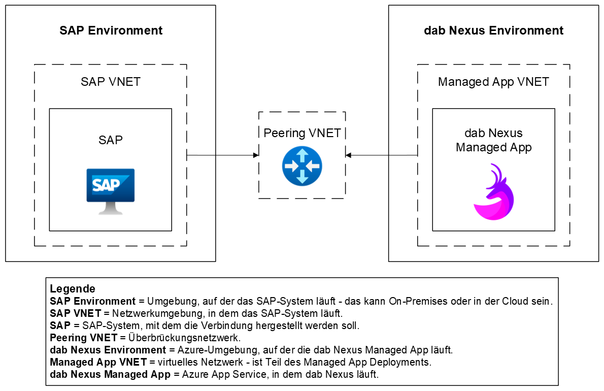 Nach der Erstellung soll es möglich sein, dass das VNET des SAP-Systems das Peering VNET erreicht. Auf der anderen Seite verbindet sich das VNET der dab Nexus Managed App ebenfalls mit dem Peering VNET, sodass die Verbindung geschlossen wird.