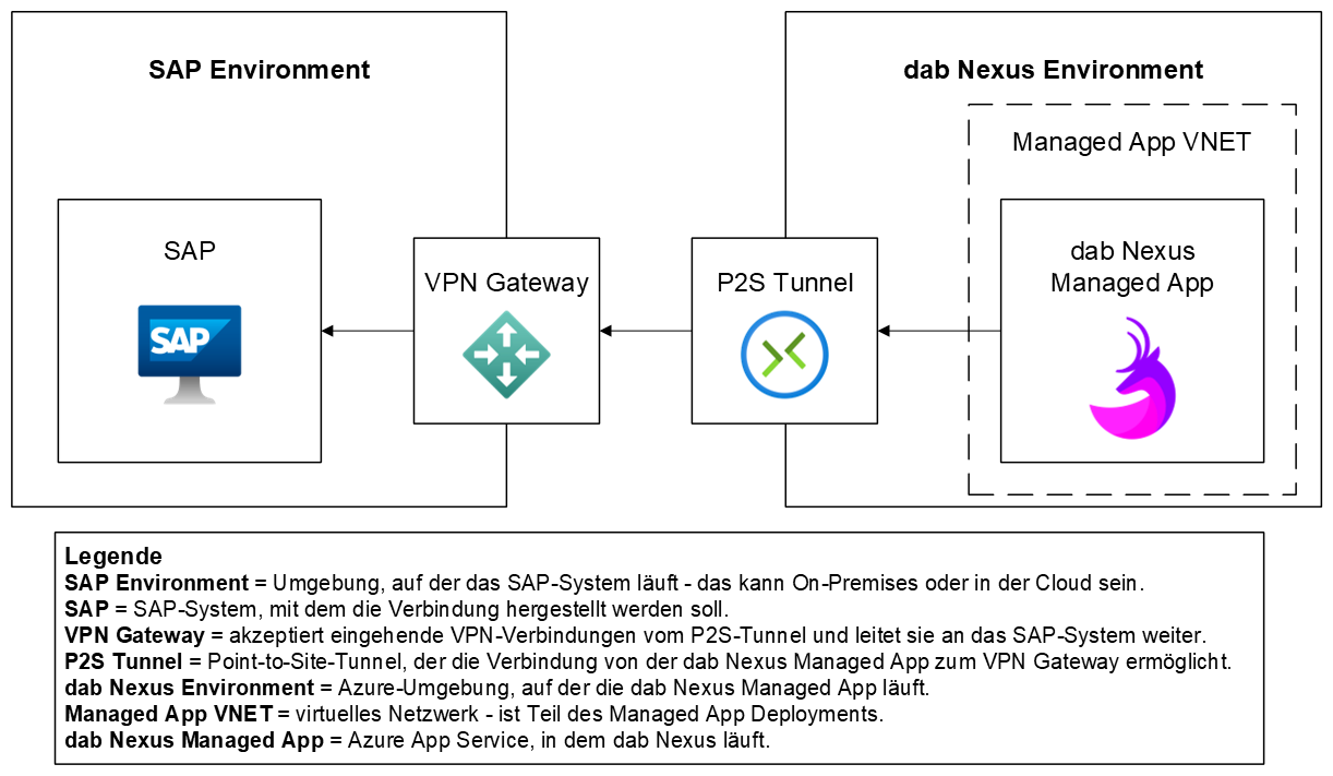 Anschließend soll es möglich sein, dass die dab Nexus Managed App über den Point-to-Site-Tunnel auf das VPN Gateway und damit auf das SAP-System zugreifen kann.
