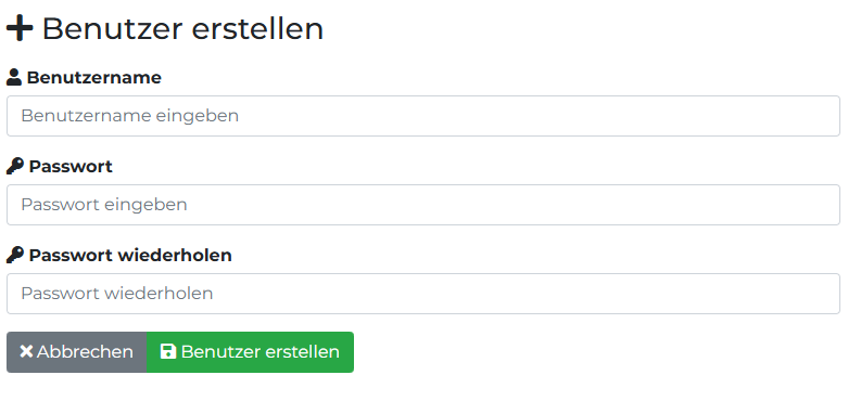 Gebe den gewünschten Benutzernamen an und vergebe ein Passwort, dass Du dann nochmals wiederholen musst. Mit einem Klick auf Benutzer erstellen wird der neue Benutzer angelegt