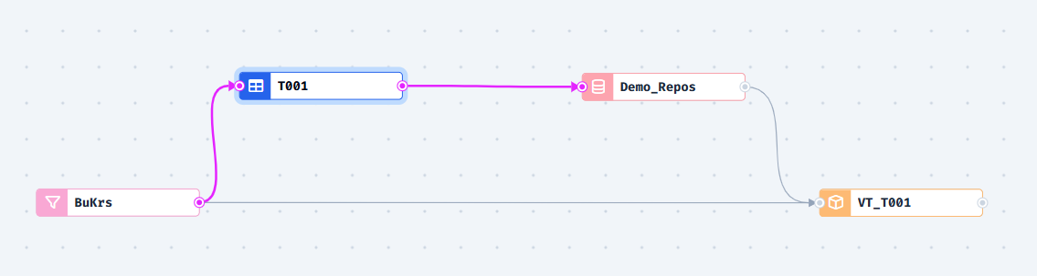 Hinterlegen wir nun auch noch bei einer zweiten Tabelle, bspw. die BKPF, den Filter und das Repository, erkennst Du, dass die Elementübersicht schnell an Komplexität gewinnt. Mit einem Klick auf die neue Tabelle BKPF (hier mit vergebenen Tabellenalias: Alias_BKPF) siehst Du nun auch die Verbindung zum Filter und dem Repository.