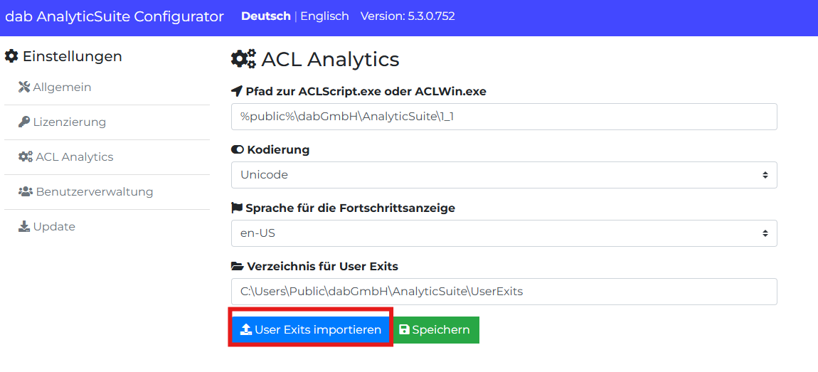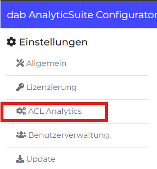 Nachdem der AnalyticSuite Configurator aufgerufen wurde, wähle den Reiter ACL Analytics.