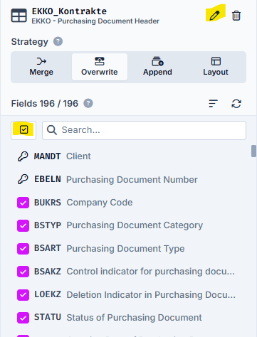 To do this, we add the repository of the contracts as a dependency to the EKKO table, click on the 'A' for the mapping, check the Custom Mapping box and change the field on the right from KONNR to EBELN.