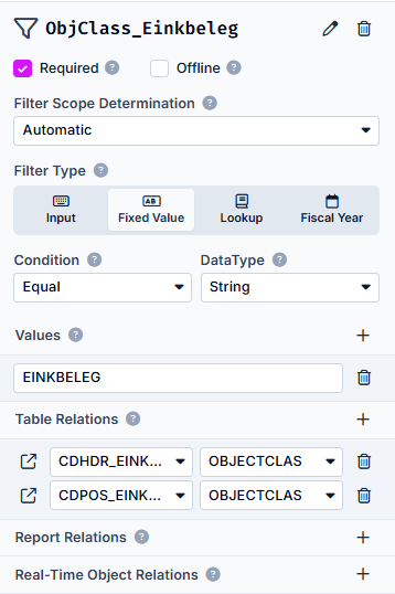 We create the filter ObjClass_Einkbeleg and leave the default values at "Fixed Value", "String", "Equal" and "Global". We enter EINKBELEG as the Value. Then we assign it to the two change tables.