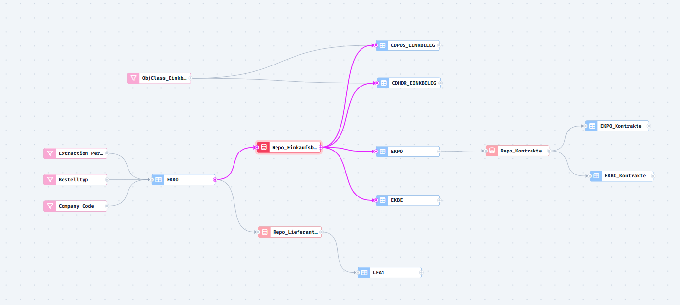 With this knowledge we decide to filter both tables CDHDR and CDPOS with a FixValue filter on the object class "EINKBELEG " and to use the already built repository of the purchasing document number to filter only the documents in scope.