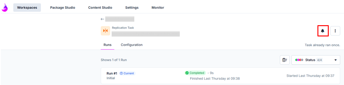 Click on Workspaces at the top, choose a workspace from the list, click on a task in the overview and then click on the Bell button at the top right of the task when the Run begins.