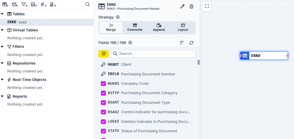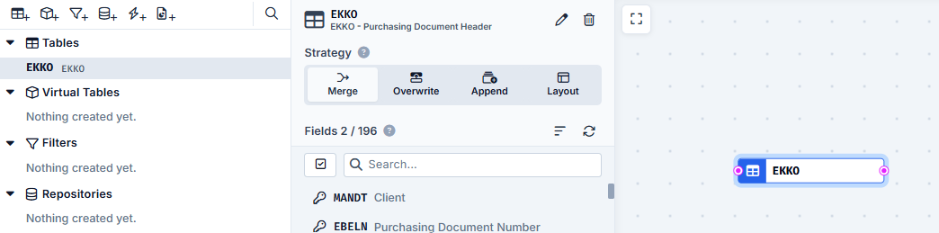 So now all we are missing is the supplier details from the LFA1 table. Many extractions tend to pull master data tables like LFA1 in their entirety. However, with a large SAP system and a quite small company code in extreme cases, this can be quite a large overhead to extract unnecessarily. For this reason, we work with a second repository, since the vendor number exists as field LIFNR in EKKO and we can thus create a second repository and thus restrict the LFA1.