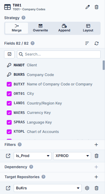 Here for T001 you can see the selected fields, the first two are the Primary Keys and the third is the indicator for whether the Company Code is used productively. The filter targets the XPROD field and the filtered Company Codes end up in the Target Repository BuKrs.