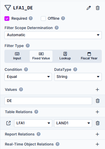 Let's now set the filter LFA1_DE and specify which tables and fields we want to filter on: