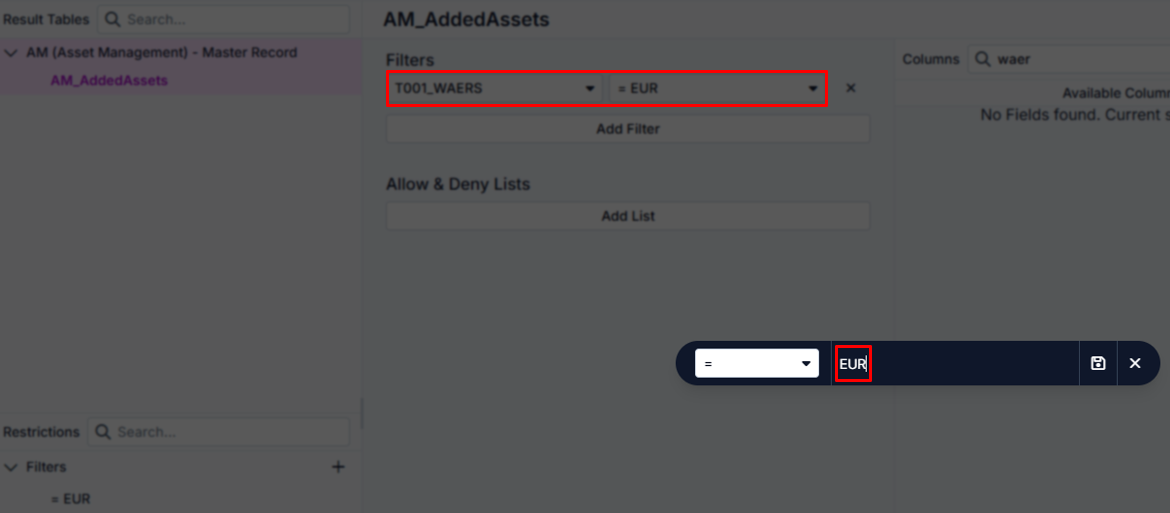 - In the dropdown on the left, you specify for which field in which results table this restriction should apply: here the Currency field in the BKPF