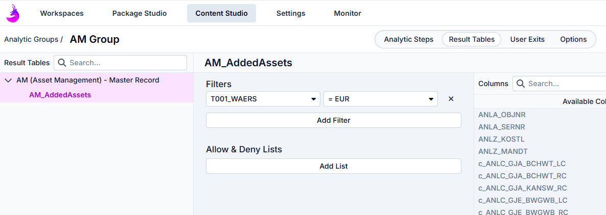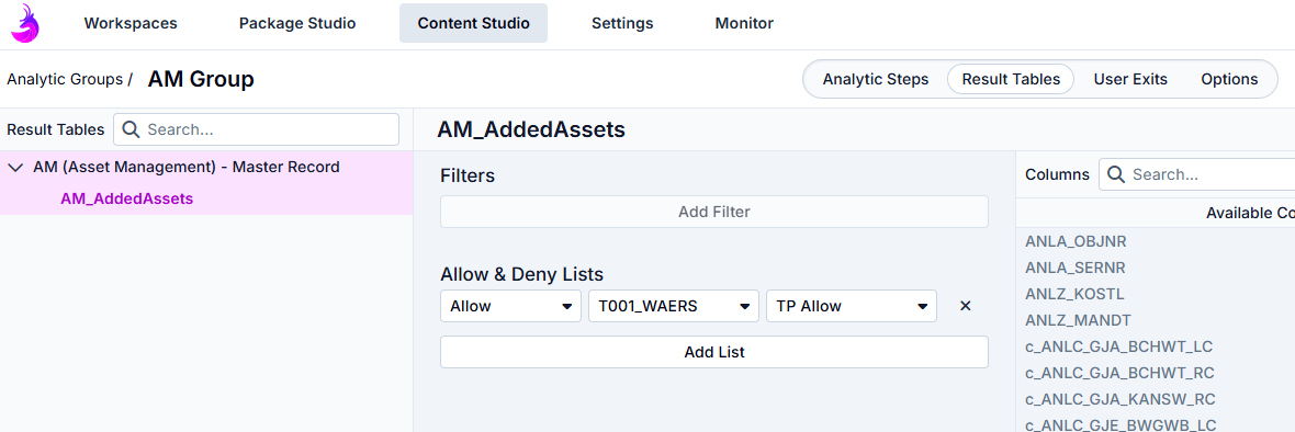 - Use the Add List button in the middle to add an Allow & Deny List for one of the results tables
