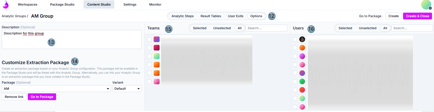 - Customize Extraction Package: you can either create a new extraction package tailored to this analytic group or select an existing one. Under 'Package', choose the desired package and then select a variant. 'Default' is the standard option.