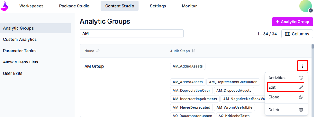 In the overview, you will now see the Analytic Group you have just created, with the optional description to the right of the name of the Analytic Group. The individual analytic steps are listed below this. If you hover over the name of the group with the mouse pointer, you will see three dots. You can use these to edit (Edit), copy (Clone) or delete (Delete) the analytic group.
