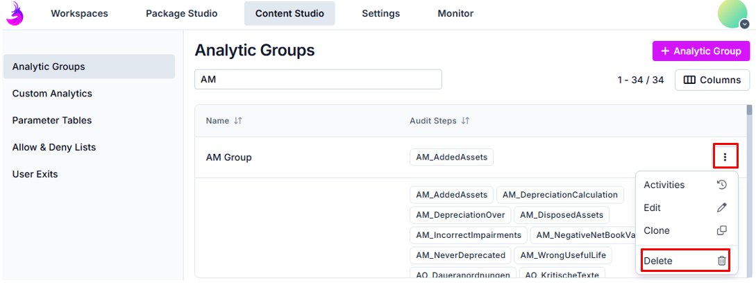 If you want to delete Analytic Groups that are no longer required or were created by mistake, you can click on the three dots to the right of the name and then on Delete.