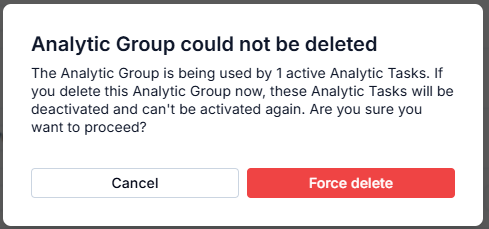 Here too, you can either cancel the process or force the deletion, which results in all active tasks that use this analytic group being deactivated.