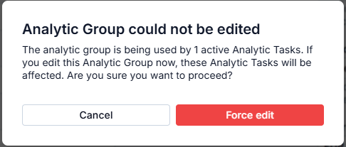 Changes to an analytic group can affect active and scheduled Tasks that have been assigned to this group. When you save the changes, you will receive a corresponding message again.