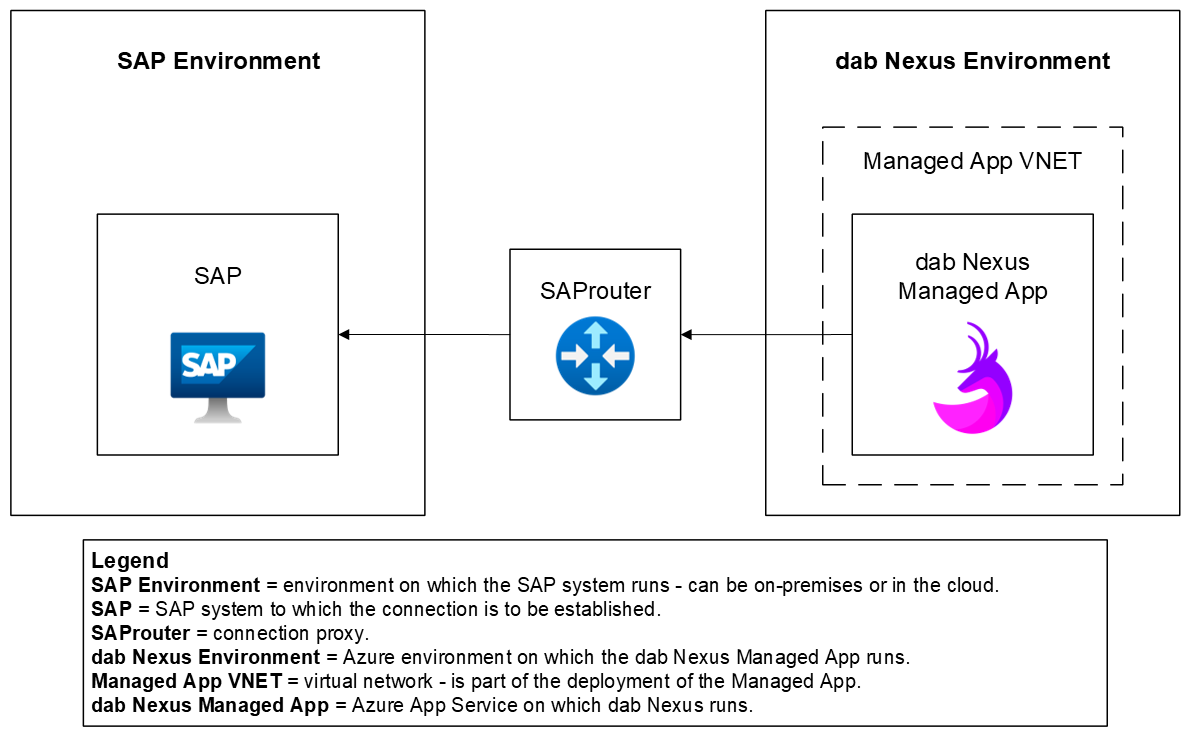 SAProuter is a solution provided by SAP that enables SAP connections to be established across network boundaries. To do this, an SAProuter instance must be set up in the same network environment as the SAP system. Once this is done, incoming connections from dab Nexus to SAProuter must be possible.