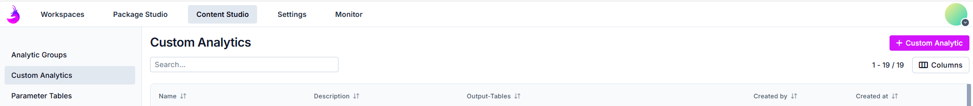 To create a Custom Analytics, click on Content Studio at the top, select Custom Analytics on the left and then click on the + Custom Analytic button at the top right:
